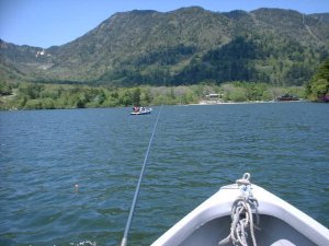 7時過ぎに着き、さっそくボートに乗りヒメマスの釣れそうな兎島付近の最深部で釣り始める