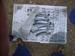また上流に移動1時頃また1匹釣り、2時半過ぎにあがる、3人で5匹、