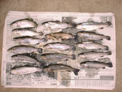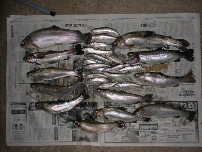 3人でニジマス16匹、ウキ下1.5m〜2m、餌ブドウ虫、イクラ