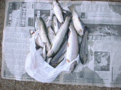 西へ移動して、ヒメマス1匹、カワマス(ブルックトラウト)5匹、ニジマス6匹、を釣り2時過ぎに
