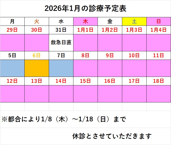 ★★★1月8日(木曜)から1月18日(日曜)まで休診★★★させていただきます。ご理解のほどお願い申し上げます。1月5日~7日までは通常どおりです。