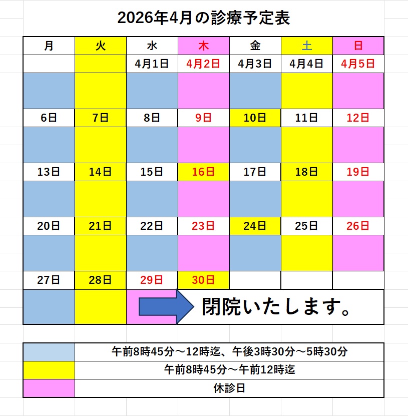 4月28日(水曜日)午前を持ちまして、前年夏よりお知らせしている通り、当院は閉院いたします。