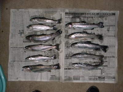 カワマス(ブルックトラウト)2匹、ニジマス11匹釣り、2時過ぎに上がりいつもの露天風呂で、