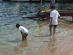 魚をみつけてる、お兄ちゃんと妹。
